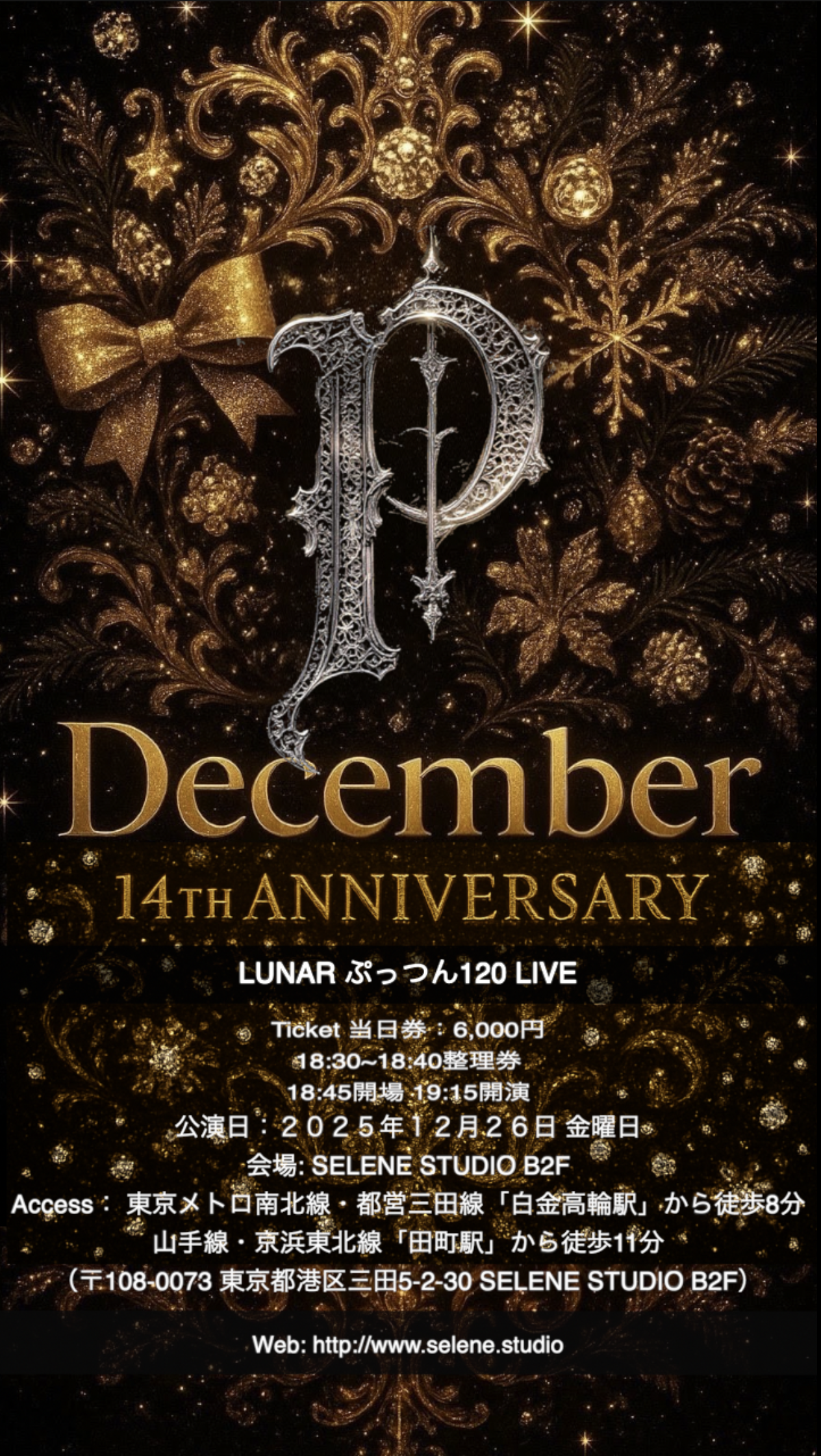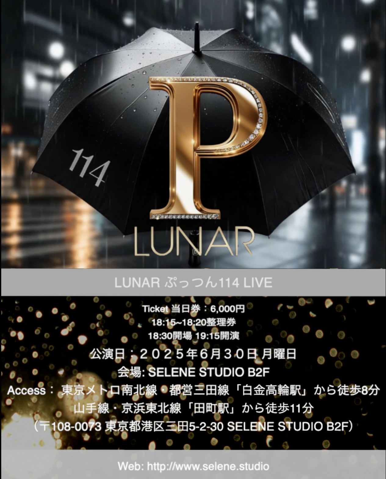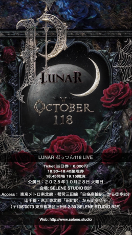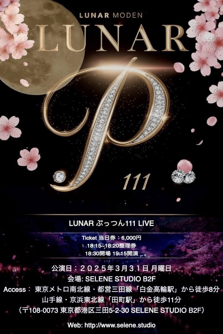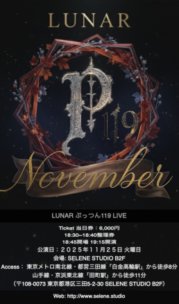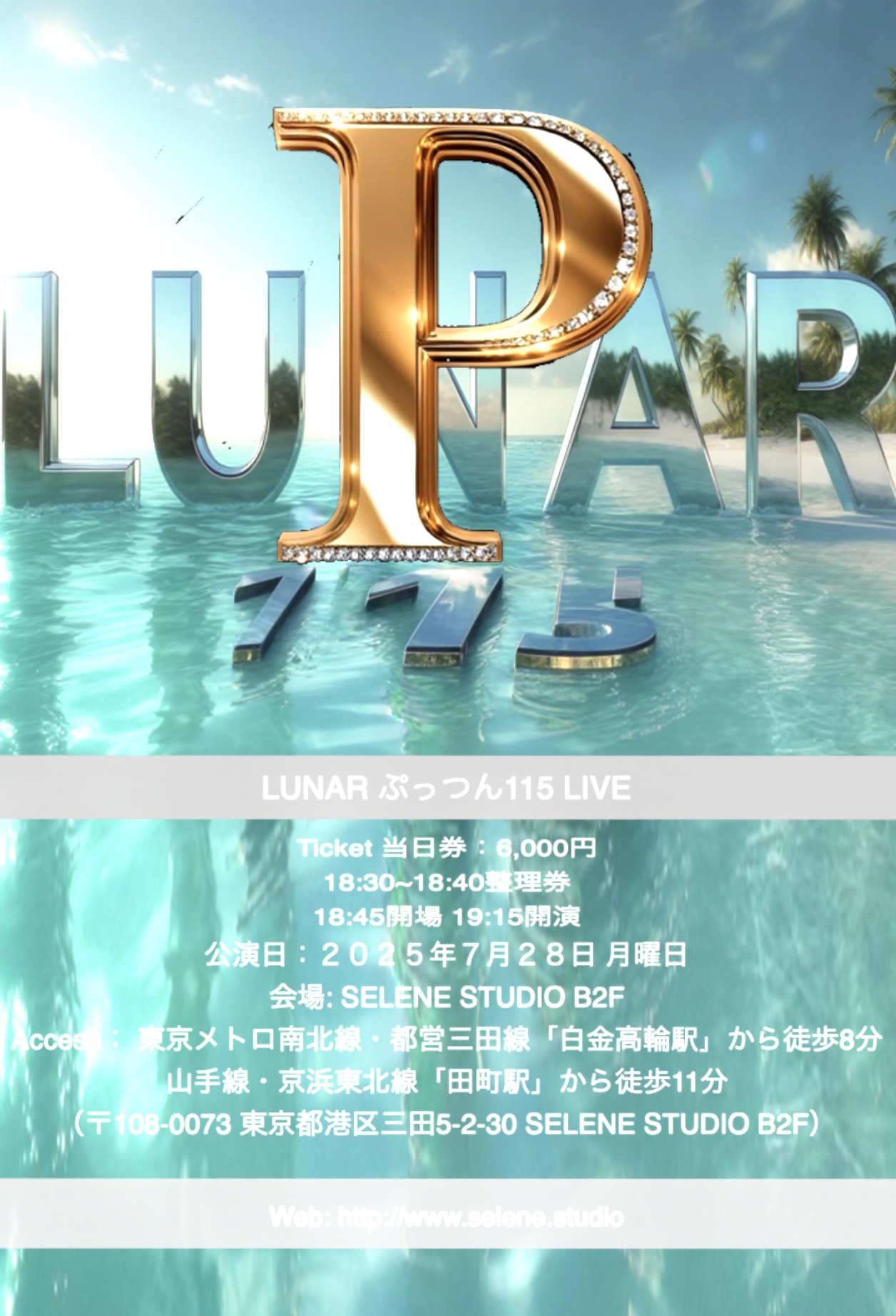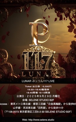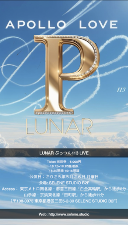 HISTORY2015年5月30日、東京タワースターライズスタジオにてLUNAR SUPER LIVEを開催。その後「ぷっつんLIVE」と称し、これまで120回のライブを開催いたしました。またファッションイベントや音楽イベントへもLIVEアーティストとして参加。 2017年2月からDAIA又はFreedomにて、℃enter LIVE(ドセンターライブ)と称し毎週、火、金、日曜日に単独での定期ライブを開催中。 FLYER ARCHIVES